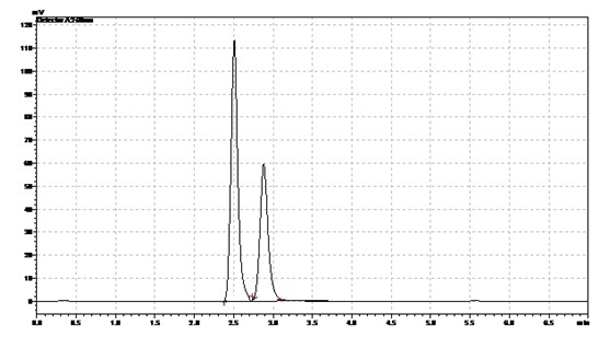 Stock solutions were prepared by dissolving 10mg of Lamivudine and 10mg of Tenofovir disoproxil fumarate, in 10ml of acetonitrile separately. Aliquots of the standard stock solutions of Lamivudine and Tenofovir disoproxil fumarate were transferred into 10ml volumetric flasks and solution was made up to the volume to yield required concentrations of Lamivudine and Tenofovir disoproxil fumarate. A typical chromatogram obtained from the analysis of drugs using the developed method is shown in Figure 3.