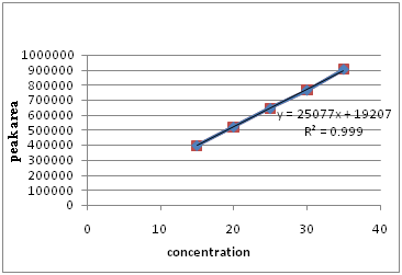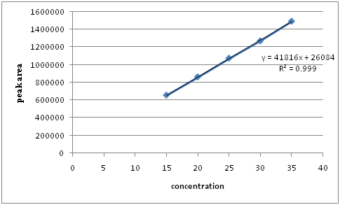 Linearity was established by least squares linear regression analysis of the calibration curve. The calibration curves were linear over the concentration range of 15-35μg/ml for Lamivudine and 15-35µg/ml for Tenofovir disoproxil fumarate. Peak areas were plotted versus respective concentrations and linear regression analysis was performed on the resultant curves. Correlation coefficients were found to be 0.999 and 0.999 for Lamivudine and Tenofovir disoproxil fumarate respectively (Figure 5 & 6). The results are given in Table 1.