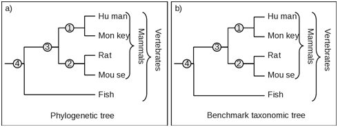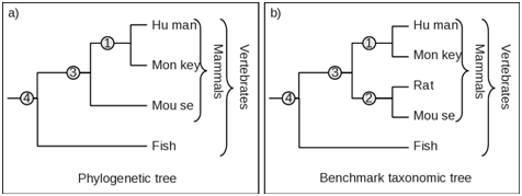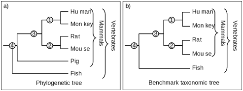 One or more species have been added to a clade in the phylogenetic tree but absent in the corresponding clade in the taxonomic tree. As shown in Figure 3, the taxonomic clade number 4 contains four species, while the corresponding clade in the phylogenetic tree has the pig in addition to other four mammals. Therefore for the estimation of Fidelity F, is based on
