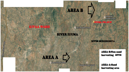 River Iuuma is in Kivaa Ward, Masinga sub-County, Machakos County (10 31’S 370 16’E) in Kenya. The surrounding environment that hosts river Iuuma has for a long time been exposed to hysterical commercial sand harvesting. Below is the map showing the study area, Figure 1.