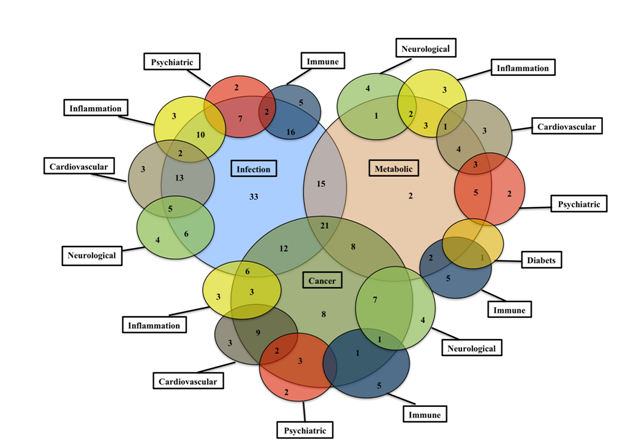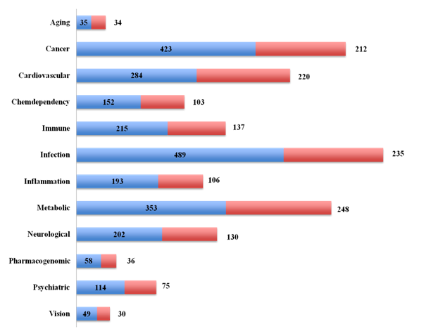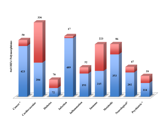 Using advanced filtering option, the Dark Matter ORF database of genes was classified into broad classes of therapeutic areas (Figure 2). The number of ORFs for each therapeutic areas (blue bars) and the number of ORFs with genetically associated SNPs (red bars) is shown in Figure 2. Largest number of ORFs was associated with three major classes: infection (n=490), cancer (n=424) and metabolic disorder (n=352). Association of the Dark Matter ORFs with multiple diseases encouraged us to undertake a further detailed analysis to provide an atlas of novel genes for target discovery.
