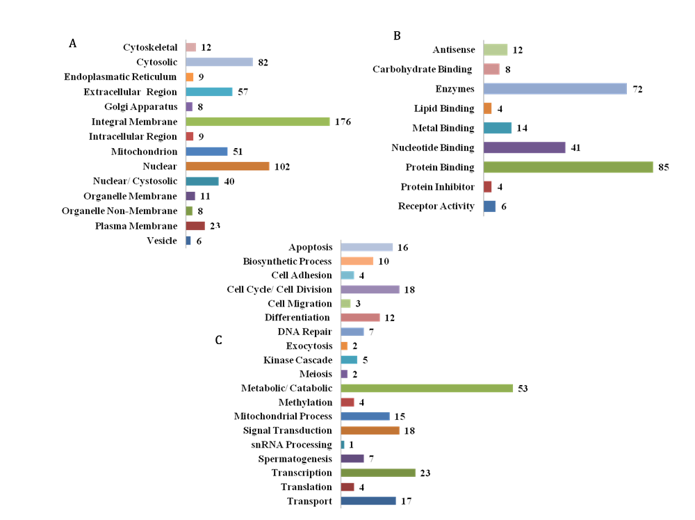 The 800 Dark matter ORFs were batch analyzed for Gene Ontology (GO) using the DAVID functional Annotation tool. Additional GO verification was obtained from the GeneALacart, the GeneCards, the canSar and UniProtKB databases (Figure 3). The ORFs were classified according to the localization (panel A), function (panel B) and process (panel C). Druggable targets (enzymes, n=92, integral membrane, n=237, transporters, n=19, receptors, n=6) and putative secreted ORFs (extracellular region, n=82) were identified by the GO analyses. Thirty-one of these extracellular ORF proteins harbored classical signal peptide sequence at the N-terminus. Further, the cell localization data (see panel A) indicated various sub-cellular compartments including the Cytoplasm, Nucleus, Golgi, Mitochondria and Vesicles. The ORFs were classified into distinct binding classes including carbohydrate, lipid, metals, nucleotide and proteins (Panel B). The Dark Matter ORFs were also associated with diverse processes/pathways including apoptosis, cell cycle, differentiation, DNA repair, metabolic, signal transduction etc. (Panel C). These results provided additional insight into the nature and putative function of the Dark Matter ORFs and suggested their involvement in multiple cellular processes involving growth control and regulation.