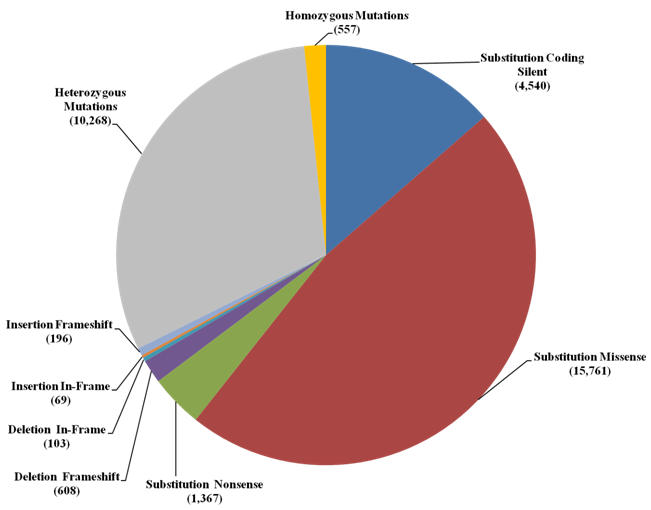 The ORFs harbored diverse mutations (nonsense, missense, deletions, insertions, frame shifts, in-frames, homozygous and heterozygous) as shown in Figure 7. Heterozygous mutations accounted for the largest number of mutations (81.57%) followed by substitution missense mutations (12.5%). Major COSMIC mutations were present in Breast (n=1,874), endometrium (n=6,528), kidney (n=1192), Large Intestine (n=7,962), liver (1,225), lung (n=7,445), esophagus (n=813), Ovary (n=833), pancreas (n=323), prostate (n=569), skin (n=1,342), stomach (n=340) and urinary track (n=861).