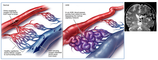 Brain AVM is a tangle of abnormal blood vessels (arteries and veins) (Figure 1), this abnormal collection causes blood to flow quickly and directly from the arteries to the veins, therefore, AVM vessels have a higher rate of bleeding compared to normal vessels. Ruptured AVMs are the main cause of haemorrhagic stroke in children and adults.1 The cause of brain AVMs remain unclear; some researchers believe that it may be caused by a rupture of blood vessels during foetal development while others suggest that they develop postnatally, undergoing a growth during childhood or early adulthood, this growth may be caused by venous hypertension or by shear stress that trigger growth factor expression by endothelial cells lining the AVM fistula. AVMs are not inherited, with the exception of hereditary hemorrhagic telangiectasia (HHT) condition. AVM is not a cancer and does not spread to other parts of the body.2 Brain AVM can occur in any region, and range in size from 3-6 cm. According to Spetzler-Martin AVM grading system, they are graded from (I-V), based on their size, location and treatment risk .3 One third of AVMs are high grade (IV-V), 90% of those are not treatable, and 25% of grad (III) AVMs are not treatable without high risk.4