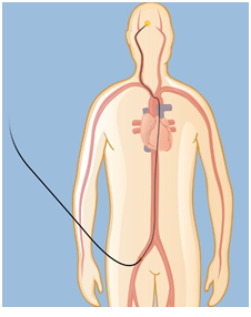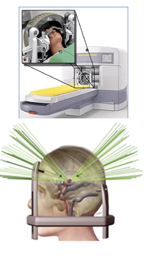 Treatment of AVM is important to prevent bleeding (haemorrhage). The risk of bleeding is 4% per year; each haemorrhage carries a high risk of permanent disability or death.5,6 Treatment will also relive the symptoms associated with AVM, such as headaches, seizures and increasing paralysis. Current treatment options are; surgery, embolization, and stereotactic radiosurgery. Small AVMs that are located on the surface of the brain are suitable for surgical removal, however the risks of surgery is high with large AVMs and the AVMs that are located in the deep parts of the brain.3 Embolization is performed under X-ray direction. A small catheter is inserted through the artery in the groin and navigated to the brain arteries,4,7 (Figure 2). This procedure itself is not usually a cure; often combined with other treatments such as radiosurgery or surgery.7 Stereotactic radiosurgery is suitable for small AVMs; with this method a focused x-ray beam or gamma-rays are delivered to the AVM such that a high dose is concentrated on the AVM with a much lower dose delivered to the rest of the brain (Figure 3). This irradiation causes AVM vessels to be occluded; however this process may take 2-3 years to complete in most patients, while the risk of bleeding still persists.