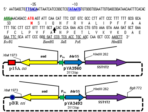 The pYA3560 Asd+plasmid was derived from pYA3493 Asd+ plasmid by substituting the pBR ori gene with the p15A ori gene. A DNA fragment encoding the β-lactamase signal sequence and 12 amino acid residues of the N terminus of mature β-lactamase of plasmid pBR322 was positioned under the control of the Ptrc promoter. A map of the pYA series vectors (pYA3560 and pYA3493) and the nucleotide sequences of the Ptrc promoter region, β-lactamase signal sequence (bla SS) and multicloning sites are shown. The Ptrc sequences for -35, -10 (RNA polymerase-binding site), and Shine-Dalgarno box (SD, ribosomal binding site) are indicated by blue and green boldface, and the translocation start codon (ATG) is in red boldface. An arrow within the sequence indicates the signal peptidase cleavage site. Unique restriction enzyme sites in the multicloning site are indicated, and 5ST1T2 is a transcriptional terminator.