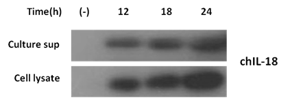 Figure 3 Identification of chIL-18 expression from constructed S. entericaserovar Typhimurium by immunoblot analysis. The chIL-18 protein expressed by χ8501/chIL-18 were detected from both TCA-precipitated culture supernatants (sup) and cell lysates by immunoblotting with 6´His-Tag antibody after 12, 18, and 24h incubations. Attenuated S. entericaserovar Typhimurium carrying empty vector pYA3560 (χ8501/ pYA3560) or pYA3493 (χ8501/ pYA3493) cultured for 18 h was used as a negative control.