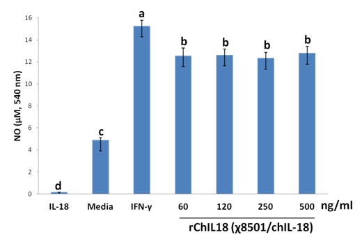 Figure 4 Induction of nitric oxide (NO) production by rChIL-18 induced IFN-γ. The biological activity of recombinant chIL-18 was assayed by stimulating primary splenocytes with chIFN-γ (control), or S.enterica serovar Typhimurium -expressed chIL18 for 72h. Supernatants from these cultures were added to HD11 culture and NO production was measured after 48h of incubation. The control media (plain IMDM) served as a negative control and COS7 cell-expressed IFN-γ as a positive control. IL-18 alone (1000 ng/ml) was also used as a negative control. Doses of recombinant chIL18 tested were 60, 120, 250 and 500 ng/ml. Values with different superscripts denote significant difference at p< 0.05.