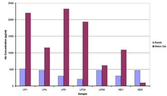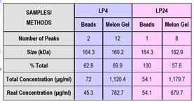 The spectrum of concentrations of antibodies after purification is shown in (Figure 5) (Table 4). With the exception of the last sample in (Table 4) (Figure 5) Melon Gel gave much higher readings for each sample concentration indicating the presence of impurities and less efficient methodological “work”. The high protein content in the last sample purified via magnetic beads (475ug/ml versus 96ug/ml), a clinically asymptomatic individual, could be due to non-efficient washing, or some external contamination with proteins.