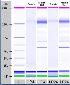 An initial comparison (SDS-PAGE) of anti-DNA antibodies purified from normal donors and B-cell chronic lymphocytic leukemia (BCLL) patients using two-step affinity purification method employing magnetic beads, revealed no apparent differences in the molecular weight and the number of bands. However, purified anti-DNA antibodies from the sera of patients with systemic lupus erythematosus (SLE) expressed electrophoresis patterns that differed from normal controls and varied between individual lupus patients from one-banded to four-banded.20–29 Numerous bands indicate that some proteins other then IgGs co-elute with the antibody’s fractions, during Melon Gel purification. The same conclusion can be applied to results of the Lab-on the Chip Agilent method (Figure 2b) (Table 4) where it is evident that LP4 and LP24 for example, show clear bands after magnetic beads isolation of about 150KDa, while Melon Gel purified antibody bands are “followed” by several bands of lower molecular weight indicating impurities in the final product of purification. At the same time, the number of peaks is six and eight times higher in those two representative samples of SLE patients (LP4 and LP24), although the MW of IgGs are similar, with similar percentage in the first sample and higher in the sample purified via magnetic beads (100% versus 57, 6) (Table 2). This really requires a larger sample size in order to be critically considered, but indicates that better purification of IgGs is achieved with the beads. Table 3 combines elecrophoretic and Agilent data in terms of number of bands, MW and concentration of the samples. Additionally, Agilent 2100 Lab-on-chip method confirmed the range of higher MW (164.3-234.7) in anti-DNA antibodies purified form patients with lupus, as compared to normal human IgG(157.9-178.8) and B-CLL (227.2) (Table 3). However, this method revealed a “hidden pattern” previously not detected by SDS-PAGE electrophoresis due to concentration limitations required for visualization by silver staining.29 Table 3 shows that lupus patients have a broad range of banding patterns (1-4) while normal donors and B-CLL patients have a similar pattern, i.e. two bands. Might this mean that clinically silent anti-DNA positive individuals and B-CLL patients have similar B-cell producers? Melon gel spin purification presented similar banding patterns for all normal controls, and lupus patients on both SDS-PAGE and Lab-on-chip Agilent 2100 which is to be expected (Figure 2b & 2c) (Table 3).