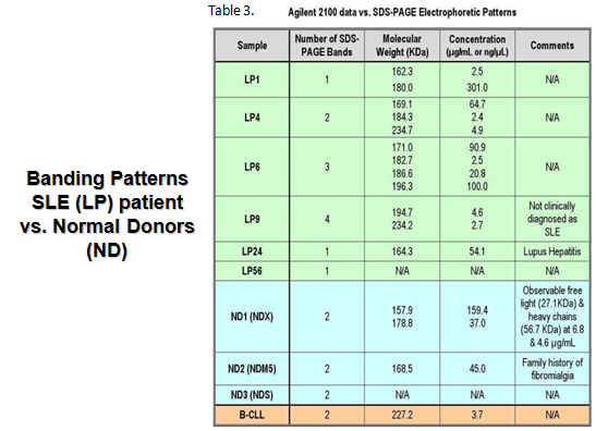 The dramatic differences in the electrophoretic patterns (number of bands and MWs) of anti-DNA antibodies isolated from normal, CLL and SLE patients might reflect different mechanisms involved in modulation of autoantibody production, the reasons for which are at this time still unknown (Table 3) Agilent 2100 data versus SDS_PAGE electrophoretic patterns). Hidden patterns identified by the more precise Lab on Chip method (Table 3) confirmed electrophoresis results. Might this mean that clinically silent anti-DNA positive individuals and B-CLL patients have similar B-cell producers? To our knowledge, this type of analysis has not been done before and so we cannot compare our Agilent data to any other information of this type.