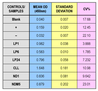 The ELISA test for determination of antibody concentration showed a broad range of CV% (1.785-23.01); therefore the results of ODs are inconclusive (Table 5) (Figure 6).