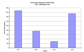 Human IgG subclass profile ELISA detected the presence of all four IgG subclasses in both beads and Melon –gel purified samples (Figure 7 & 8). The values expressed in ug/ml were considerably higher in Melon –gel purified samples (over 1600 for IgG1 versus 46 in the bead samples), with similar participation of Igg1, IgG2 and IgG3 and difference in IgG4 being much higher in the Melon-Gel purified group. Since it is the same sample, and two different methods, we believe that higher value in Melon-gel isolated IgG4 is due to technical problem with pipeting that has created a false increase. These data are compared to the referent values for antibody subclass (Figure 8) (Table 6). As shown in Figure 7, the percentage participation in bead-isolated antibody subclasses is similar. The same was true of the PI range that will be shown later on.