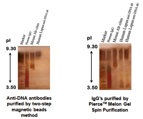 In this analytical study, compared to the magnetic bead method, Melon gel allowed for faster antibody purification and higher recovery rate, but produced a final product of significantly lower purity when analyzed by both PhastGelTM and Agilent 2100 methods. Electrophoreses and Lab-on chip analyses have revealed that purified anti-DNA antibodies from the sera of patients with SLE express electrophoretic patterns that differ from normal controls and vary between individual SLE patients. The meaning of this “patternization” is unknown, but could be due to somatic mutation, glycosylation and/or elongation. IEF data strongly suggested polyclonal nature of purified anti-DNA antibodies, in SLE and monoclonal in normal donors and B-CLL patients.