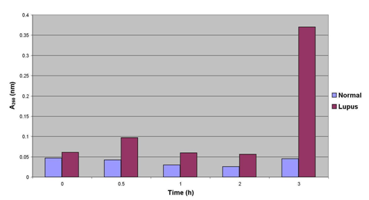 Figure 11 displays the results of UV spectrophotometric analysis for antibody ssDNA hydrolytic activity performed on anti-ssDNA antibody isolated from normal individuals and lupus patients via the magnetic-bead method. There is no significant change in OD in normal samples, however there is a drastic increase after 3h incubation in the lupus patient antibody hydrolytic activity.