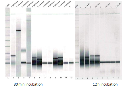 Agilent -Lab-on-chip- data (Figure12a & 12b) confirmed the initial hydrolytic data obtained by UV spectrophotometry. We can see from Figure 12a that the DNAse1 reaction occurred very rapidly (about 30min necessary to obtain small (20-50bp) nucleotides starting from about 400bp herring sperm -ssDNA as the substrate). However, (Figure 12b), about 12h of incubation at 37°C degrees was necessary to hydrolyze the same substrates to small nucleotides by anti-ssDNA antibody.
