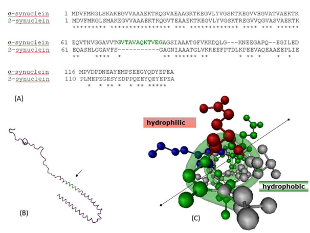 Two other members of synuclein family are β-synuclein (SNCB) and γ-synuclein (SNCG) located on 5q35 and 10q23.2, respectively. The predominant expressions of α- and β-synuclein expression overlap in the same regions of brain, while γ-synuclein is primarily expressed in peripheral nervous system and retina.12 Sequence comparisons reveal deletion of 11-mer region (73-83 of SNCA) in β-synuclein as shown in Figure 1.13 Despite having similar expression profile and homology, where SNCA is ubiquitously found in synucleinopathies, SNCB and SNCG are not found in Lewy bodies, the hallmark of PD. In this study, we have used computational tools to understand the role of this 11-mer peptide, its involvement in the dimerization of SNCA, and discuss ways to use this insight towards synucleinopathies therapeutics.