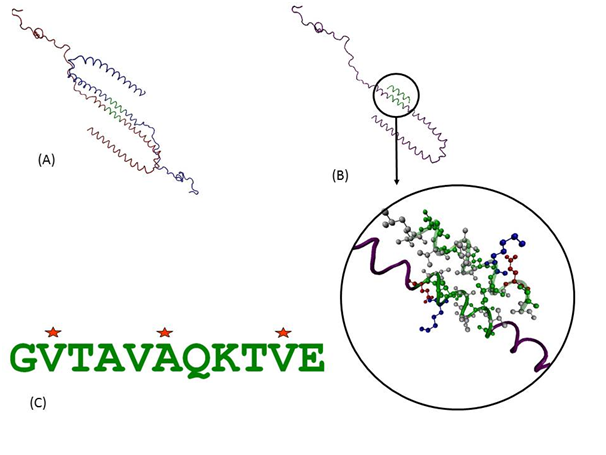 Protein-protein interactions can provide a wealth of information about function and behaviour of molecules. As there was no available structure for dimer or oligomer of SNCA, we used available state of the art computational prediction methods to address this crucial step. Detailed analyses of predicted protein-protein and protein-peptide docking interactions of the initial assemblies indicate that the interactions are purely hydrophobic in nature and are indeed predicted to be mediated through this 11-mer peptide as shown in the docked model in Figure 2a & 2b. It was observed in the predicted models that the charged and polar side chains are pointed away from the dimer while the non-polar side chains are present in between the two helices. The 2nd Val, 6th Ala and 10th Val of the 11-mer were involved in the hydrophobic interactions. We further investigated which of these positions play more important role and if there can be peptides with better binding than wild type sequence. Such knowledge can help guide designing of molecules that can bind to individual monomers and stabilize them, thus having inhibitory effect on formation of aggregates.