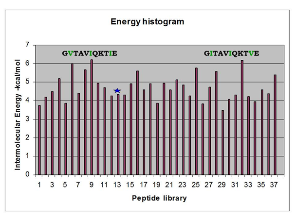 Three positions which were involved in the hydrophobic interactions were selected to be computationally mutated into Leu, Ile or Val. Two of these positions already had a Val and these were mutated only to Leu and Ile. This led to a library of 36 peptides which were used to dock on the SNCA protein molecule within the grid defining the 11-mer region. These 36 peptides along with the peptide with wild type sequence were docked on the SNCA and were evaluated based on the intermolecular energy in kcal/mol. The schematic of the procedure is shown in Figure 3. As shown by the energy histogram in Figure 4, there were several peptides which showed a better (negative) intermolecular energy than the peptide with wild type sequence (shown as blue star in Figure 4). Two peptides with lowest intermolecular energies are also shown. A common feature of these two peptides with better binding is presence of a larger hydrophobic group (Ile) in the centre of the assembly i.e. 6th position in the 11-mer peptide. This position thus seems to be important and can be potential target for inhibitory molecules designed to halt the protein aggregations in synucleinopathies involving SNCA.