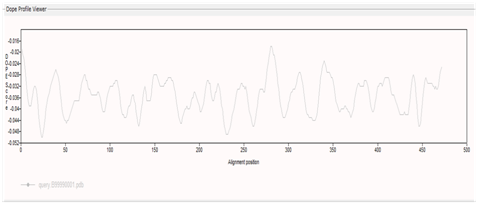 Following essential dynamics analysis (ED), the orthogonal movements describing the variance of a system is obtained by diagonalization of the covariance matrix (Figure 13). The results of the analysis is generated as set of eigenvectors (modes/ principal components), which describe the nature of the deformation movements of the pyruvate kinase see Figure 14a &14b and set of eigenvectors which indicates the stiffness associated by each mode. The eigenvectors are ranked as shown in Table 4 after a principal component analysis; the first one is the explaining the largest parts of the variances. Apparent stiffness helps to detect strong interactions between which indicate physically-intense direct contact or strong chain-related interactions. The 2D N x N plot see Figure 15 indicates the exact value of the apparent stiffness of all the modes in the normal mode analysis, with a maximum value of 18590000.00Kcal/Mol*Å2 and minimum value of -18870000.00Kcal/Mol*Å2. The standard measure of residue/atom flexibility is given by B-factor. The B-factor profile for mode 7 represents the distribution of the residues harmonic oscillation. Very large B-factors should take to indicate very flexible residues that might display conformational changes along the trajectory, which is difficult to follow within the harmonic approximation implicit to B-factor analysis.
