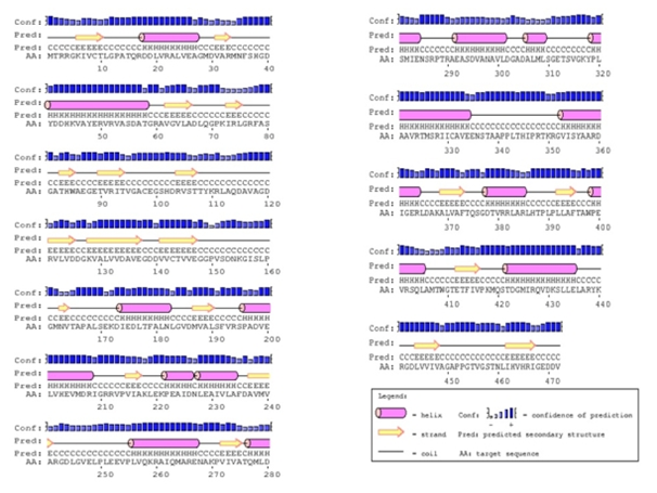 To have a broader chemistry on pyruvate kinase, the primary structure of the protein was studied using ProtParam tool (http://expasy.org/cgi-bin/protparam)29 of ExPASy proteomic server. Various physic-chemical parameters such as molecular weight, isoelectric point, instability index, aliphatic index and grand average hydropathy (GRAVY) were computed. PSIPRED server30 was used for the prediction of secondary structure of pyruvate kinase enzyme.