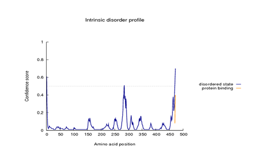 Detection of hinge points is crucial in characterizing the dynamics and flexibility of a protein, since, hinge motions are similar to rotations around an articulated joint and therefore can be very large. Hinge motion is characterized by large changes in main-chain torsional angles occurring at a localized region and usually involves a small number of residues, since even one bond can provide the required rotational freedom. This kind of protein motion is free of packing constraints. When a chain exhibits hinge motion at the region connecting two structural domains, each domain behaves as a rigid body and packing interactions can appear/disappear between the interfaces of those rigid bodies. Hinge motions usually occur upon binding to another molecule, or upon activation/deactivation of the protein. This was carried by three different methods, such as B-factor slop change (Figure 17a), and force constant method see Figure 17b and dynamic domain detection methods see Figure 17c. Even if the movements are specific for each domain, it has been observed segmentation in each rigid body with residues 1-68, 174-215, 258-472 and residue leu 190, ser 191, phe 192, val 193, arg 194, ser 195, pro 196, ala 197, asp 198, val 199, glu 200 are contributing flexibility in hinge regions.