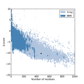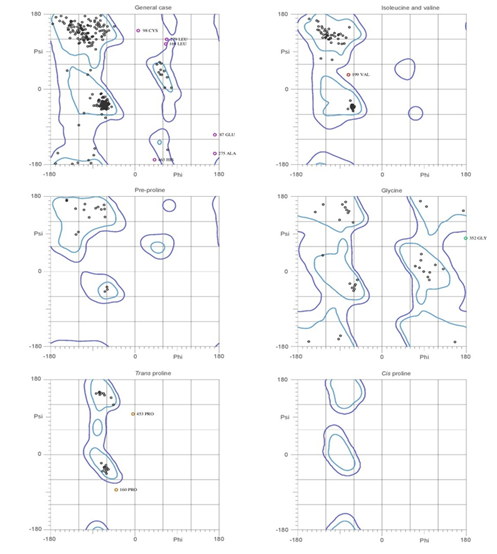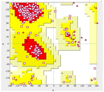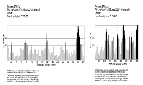 Quality assessment of generated model: The quality of Pyruvate Kinase model was evolved by a number of tools to test the internal consistency and reliability of the model. For the analysis of stereochemistry of protein model built, quality of the model and its compatibility were carried out by using Structural Analysis and Verification Server (SAVES) (http://nihserver.nbi.ucla.edu/SAVES/). Procheck35 analysis, which quantifies the residues in available zone of Ramachandran plot, was used to assess the stereo chemistry quality of the model. ERRAT36 tool, which finds the overall quality factor of the proteins, was used to check the statistics of non-bonded interactions between different atoms types. Similarly to determine the compatibility of the atomic model (3D) with its own amino acid sequence (1D), the VERIFY-3D37 program was used.