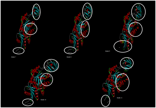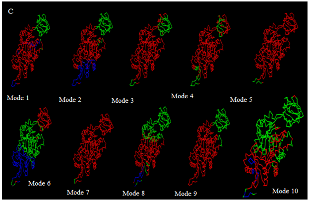 Normal mode analysis (NMA) is one of the major simulation techniques used to probe the large-scale, shape-changing motions of the bio molecules.14,16,17,34 For standard NMA, one needs a set of coordinates, a force field and software to perform the calculation. The structural information was stored in the PDB file. Several software tools are available to perform NMA, which are normally used to interpret the file to determine the correct energy function using the selected force field. Flexibility of the structure of a protein is an essential property and is crucial for the substrate binding for an enzyme. The normal modes are straightforward to calculate, particularly in the simplified framework of the elastic network model (ENMs) and provide a basis of orthogonal vectors to drive conformational transitions with a few degrees of freedom as possible; amphasizing the large amplitude and collective movements if one focus on low-frequency modes.42-44