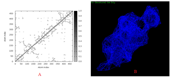 Figure 12 (A) Map showing 2D plot of residues on both axes for the elastic network model of pyruvate kinase representing lowest-frequency mode 7. (B) Elastic network model of pyruvate kinase (mode 7) showing connections between C-alpha atoms. The interaction with a cutoff distance of 10 Å is illustrated as blue solid lines (for mode 7).