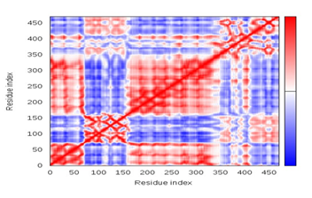 The covariance analysis determines connections between the movements of the residues. The correlations are indicated as a 2D N x N plot see Figure 16; where each row and column represents a residue. Each position shows the correlation values for that pair of residues and the cell is coloured with a white to green gradient for positive correlation and white to red for negative correlation. The collectivity index values are calculated to numerically measure the number of atoms affected by a given mode. The Table 4 gives the collective index values, where the high value indicates that the corresponding eigenvector (principal component or mode) effects many of the atoms while correspondingly lower values indicating the eigenvectors that has a more local behaviour.