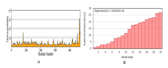 Figure 14 (A) The Plot shows the deformability (flexibility) of the predicted normal modes by considering only the Cα atoms of amino acids. (B) Plot representing the histogram of all the low-frequency normal modes with their eigenvalues.