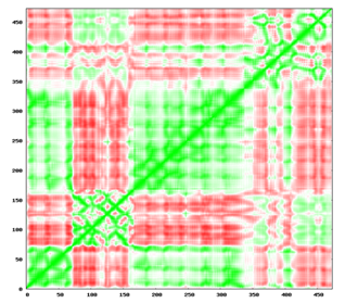 Figure 16 2D plot indicating correlation between the movements of residues. In the above square matrix, each row and column represents a residue and each position shows the correlation value for the pair of residue and the cells are colored with a white to green gradient for positive correlation & white to red for negative ones.