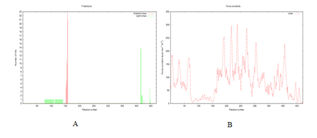 Figure 17 (A) The plot shows hinge point prediction by B-factor slop change method. In the above plot uphill (green) determines related to a change from low to high B-factor and downhill (red) to other side. The amino acid sequence is labeled below; colored in which the same code as the graph. Brighter the color indicates the increased confidence in the predicted hinge. (B) The graph represents the computed force contact for each residue. The peak force constants will probably correspond to the residues in the interdomain regions.