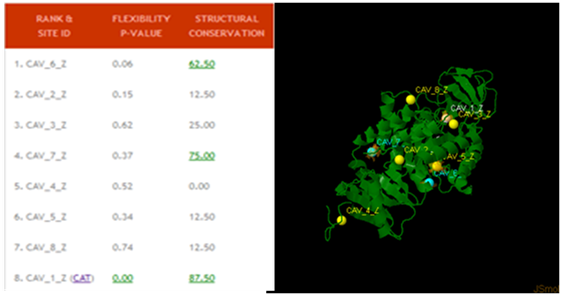 Direction of movements: In order to describe the relative movements of residues in each normal mode, residue-residue distance variation maps are displayed. A high similarity of the different squares corresponding to the different domains is clearly observed along the diagonal. This illustrates the symmetrical behaviour of the system. The relative motions of the amino acids are clearly localized in the terminus regions of the protein. The amplitude motions of the region towards the cytoplasmic medium are much large helixes, as illustrated in Figure 11, by kink of the helix for the lowest frequency mode. For the other slow modes which are degenerate, the relative motions of each domain in the structure are not symmetric. For the modes of high frequency, the global motion is more complex, the segmentation in rigid body becomes fuzzier and the movement of the loops are much more disparate. The use of normal mode theory on the particular system, such as the allosteric mechanism of pyruvate kinase without adding external mechanical stretch makes possible the exploration of the enzyme global motions. The non-degenerate modes seen to be implied in the conformational rearrangements occurring during the catalytic activity of the enzyme in formation of pyruvate (product) from phosphoenolpyruvate (substrate) in presence of the co-enzyme ADP which is further converted to ATP. Through allosteric regulation, the phosphoenolpyruvate binding site is distorted by transition from the R-state to T-state. Allosteric process also allows an enzyme activity to the coordinated with other cellular reactions and signalling pathways. The allosteric site is located distinctly from the active site and is entirely located in the enzyme in interface between domains A and C (Figure 18). A phosphate-binding site for the allosteric activator is created by residues encoded regions (Figure 19) of the gene that corresponds to spliced exons of isoenzye. FBP activation induces several conformational changes among active site side chains which involve significant domain motions.55 The flexibility of the residues in the domain interface assist large conformational changes in the binding sites of substrate was clearly observed in the lowest-frequency modes 7, 8 and 10. The relative motions between the pyruvate kinase domains play a key role in the allosteric regulation of the enzyme activity.56 The catalytic centre is build up by residues belonging to the three largest loops (loop 6, 7 and 8) of the α/β Interestingly, ser 310, the only amino acid that has dihedral angle outside the allowed regions of the Ramachandran plot of the pyruvate kinase model structure. It has been found that loop 6 of the α/β barrel takes part in the binding of PEP. In the inactive state this loop undergoes a conformational change that distorts the active site. This alteration of the catalytic centre explains the low affinity of the T-state for the cooperative substrate binding and is directly coupled to the subunit rotation. The role of loop 6 as a flexible element participating in substrate binding and catalytic feature common to several other α/β barrel containing enzymes. The domain interface and disordered regions are important in the function of the protein, since these regions are dynamically flexible and are distinct from irregular loop secondary structure, which are static in solution as shown in Figures 20a & 20b. Here in M. tuberculosis pyruvate kinase it is observed the presence of additional loop in C-terminal. Interestingly, 8 allosteric sites detected by PASA server, such as, CAV-6, CAV-7 and CAV-1 with the flexibility P-value of 0.06, 0.37, and 0.00, showing structural conservation value of 62.50, 75.00 and 87.50 respectively see Figure 21. It has shown that these cavity’s were observed in the two domains present in the enzyme which facilitated by large movements in the terminal residues (such as pro 423, pro 424, ile 467, gly 460, val 472). And also these conformational motions of the domains are observed in the low-frequency modes. The Lindemann coefficient for the low-frequency mode by standard NMA gives by the value 0.156Å. This coefficient is an estimate of the solid-liquid behaviour of the protein. The behaviour of the residues inside the enzyme pyruvate kinase (the buried ones) has a lower Lindemann coefficient (as more solid-like) than the residues that remain in the surface of the protein. In the present study, we present the information on the nature of the conformational change is often carried by the open form of the enzyme. This will provide a route to check the hypothesis about the kind of conformational change that the protein undergoes to perform its function.