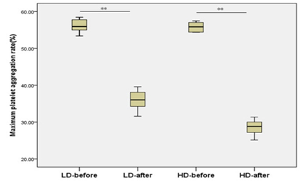 Rat blood samples were collected from the orbital sinus and subjected to platelet aggregation analysis. As shown in Figure 1, the maximum platelet aggregation rates were significantly decreased after aspirin administration in both (LD and HD) groups.