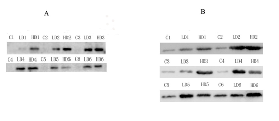 Pro-EGF and CD10 were selected for further validation in the other 6 rat by western blotting. Pro-EGF is associated to platelets and it was detected in platelet-rich plasma and can be secreted to the urine.18 In previous studies, there is no correlation reported between CD10 and aspirin, however, it was changed significantly in our experiment and the mechanisms need to be further studied. As shown in Figure 2, pro-EGF (166kD) and CD10 were both significantly increased after aspirin administration; therefore, we propose that these two proteins may be useful in monitoring platelet aggregation. Regardless, no obvious dose-dependent relationships between the abundance of these two proteins and the dose of aspirin were observed, suggesting that other proteins affected by low-dose aspirin administration may serve as more reliable biomarkers for assessing the blood coagulation status.