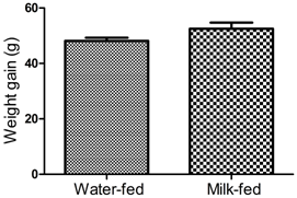 The average milk intake of the rats (the average is 60ml) in the milk-fed group was greater than the average water intake of the rats (the average is 46ml) in the control group, while the rats in the control group had a higher average food intake (the average is 29g) than the rats in the milk-fed group (the average is 16g). These trends could be observed during each day of the experiment.