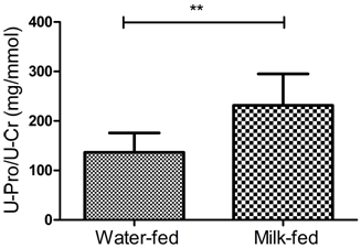 The rats were divided into 2 groups: a control group (n=8) and a milk-fed group (n=8). Every four rats were housed in a cage. The control group rats were given free access to water and were not provided with milk. The milk-fed group rats were given free access to milk and were not provided with water. Food intake, water intake and weight gain were recorded daily. Urine samples were collected after 1week and stored at -80°C. Protein and creatinine concentrations in the urine were measured at the Beijing Union Medical College Hospital.