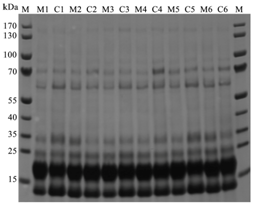 A total of 20µg of protein was suspended in sample loading buffer and then incubated at 96°C for 5min. The proteins were separated in SDS-PAGE. The gel was stained with Coomassie brilliant blue dye.