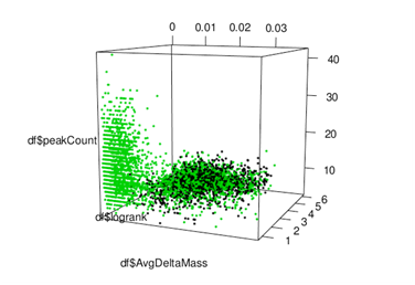 When the 3 components of S-score are plotted in a 3-D cube, a few thousand non-decoy points (including duplicates with high sequence homology) become clearly separated from the background. (See Figure 1 above) The S-score of any point is its distance to the “S-score=0” plane along the Avg Delta Mass axis.
