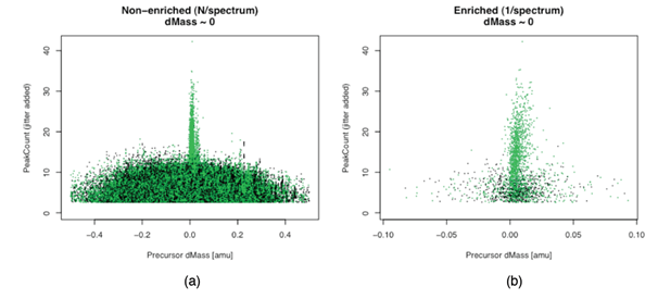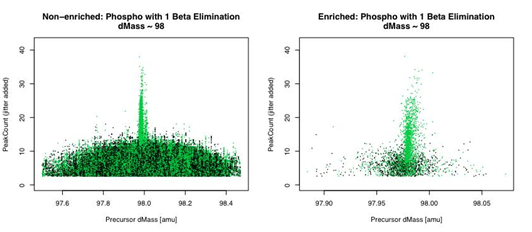 Figures 3a & 3b show the Peak Count vs. dMass for unenriched and enriched candidate peptides IDs from the search results. They clearly show a population of likely-correct IDs with a single labile phospho-site.