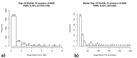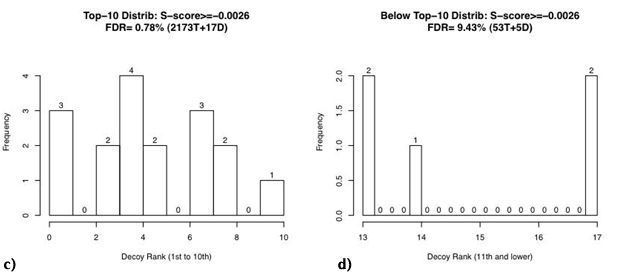 Figures 4a‒4d show the histogram of the original score rank of the final ID hypotheses with estimated FDR < 1%, split into {Target vs. Decoy} x {Top-10 vs. Below-Top-10}. Note that XCorr ranks to 500th are considered, but the lowest ranked target and explicit decoy are 245th and 17th, respectively.