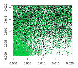 Figure 2 Scatter plot of Peak Count vs. Precursor Delta-Mass with dMass~0 [non-decoys in green; decoys in black].