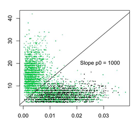 The line slope in each of two 2D projections plotted against Avg Delta Mass – peak Count and log (Rank+1) - may be used to estimate p0 and r0, respectively. Resolution of 100 seems to be more than sufficient for both parameters.