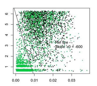 Figure 7 shows a clearly large population of likely correct IDs with raw rank=1 [i.e. log (Rank+1)=0.693] and low Avg Delta Mass. There is a generally linear boundary shown with representative line of slope -r0.