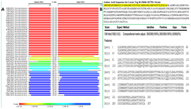 Figure 1 The protein BLAST (BLASTp) search against the annotated NCBI protein database retrieved the Y-49 protein sequence as a class A β-lactamase (A). Further alignment of the Y-49 amino acid sequence with the amino acid sequence reported for 3M6B.pdb revealed 100% identity (with no gaps) spanning 265 amino acids in both proteins, except for a 42-amino acid sequence located at N-terminus of Y-49, used for insertion into membrane (6) (highlighted in yellow) (B). 3M6B.pdb was used as a target protein in the molecular docking experiments.