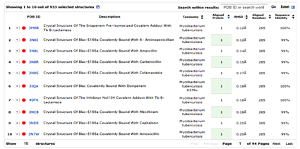 The FASTA sequence of Y-49 β-lactamase was subjected to sequence similarity search using BLASTP algorithm24 and the protein hits with more than 99% sequence identity were further searched against the Brookhaven RCSB PDB database for finding of additional proteins with sequence and structural identity using the VAST (+) algorithm andmMDB database.25 The top ten hits displaying more than 99% sequence identity and less than 0.25Å RMSD for their structural similarity were identified and further analyzed for the resolution and accuracy of their X-Ray structure.