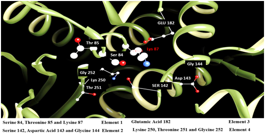 The final hits were sorted according to predicted binding affinity inkcal/mol, eliminating poses with unfavorable binding energies (e.g. >-8.0kcal/mol (more negative values are more favorable). We also included an additional scoring function, namely the minimized RMSD (mRMSD) that is the RMSD between the query-aligned pose and the minimized pose. This score provides an indication of how far the compound has deviated from the original query.20 Minimized results were also thus sorted to exclude poses with significant deviations from the original query (e.g. 2Å). We performed an independent analysis of the pharmacophore features to assess the contribution to the relative free energy of interaction between the ligand hits and 3M6B protein by employing Molegro Molecular Viewer (MMV), and Molegro Virtual Docker (MVD) software. In addition, the Molegro Dock software generated EPair energy terms, expressed as MolDock scoring functions. The MolDock scoring function consisted of mainly the pairwise (PLP) steric and hydrogen bonding energy of interaction between each lead compound and the amino acid residues from the active site of target β-lactamase protein (Depicted as chain A in Table 2).