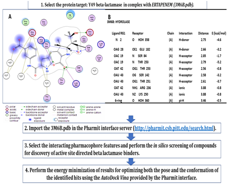 Figure 5 Workflow describing the procedure used to perform the in-silico screening of active site directed binders forY-49 β-lactamase by employing pharmacophore searching and molecular docking with AutoDock Vina provided at the Pharmit server (http://pharmit.csb.pitt.edu). The MOE (Molecular Operating Environment) package was used to extract and visualize the main protein-ligand (carbapenem ertapenem (RG1)) interactions within 5 Å from the ligand, in the target protein structure 3M6B.pdb (A). Details of the active site amino acid contribution to the free energy of interaction between the original ligand (RG1) and Y-49 β-lactamase are displayed as hydrogen bonding, electrostatic (ionic) and steric interactions with the original ligand from 3M6B.pdb (B).