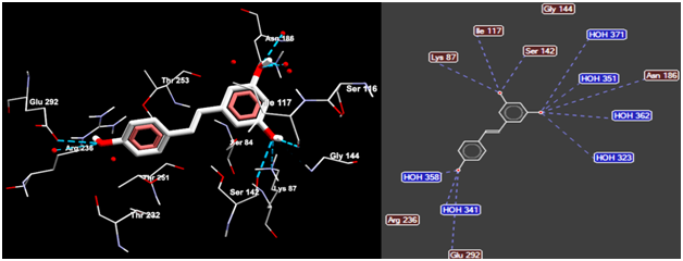 Figure 8 Molegro Viewer enabled the three-dimensional display of the structural details describing the interaction between the best docked pose of resveratrol (CPK colored) and the active site residues of 3M6B β-lactamase (left panel). AutoDock Vina was used to perform the rigid docking which predicted a free energy of about “-6.8 kcal/mol” characterizing the interaction between the resveratrol and β-lactamase. The hydrogen bonds established between the hydroxyl oxygen groups from resveratrol and the selected amino acids and water molecules in the active site of β-lactamase are displayed as dotted blue lines (right panel).